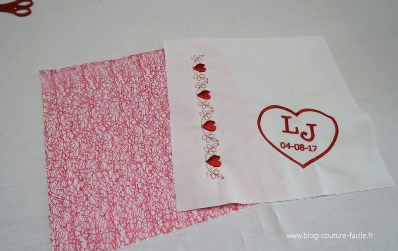Concernant la broderie machine, j’avais préparé une sélection de police d’écriture et Sylvaine les a éliminé au fur et à mesure afin qu’il n’en reste plus qu’une. J’ai ensuite ajouté un cœur tout autour des initiales à la demande de Sylvaine.